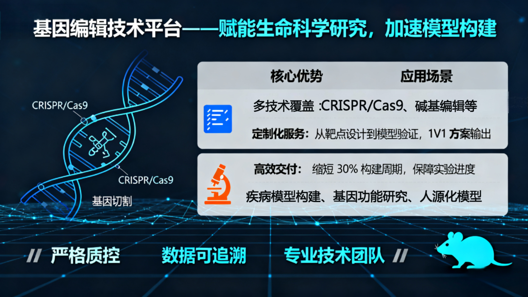 卓越的專業團隊:擁有資深獸醫、基因編輯和胚胎操作技術的科研團隊,確保實驗設計的科學性與操作的規范性;